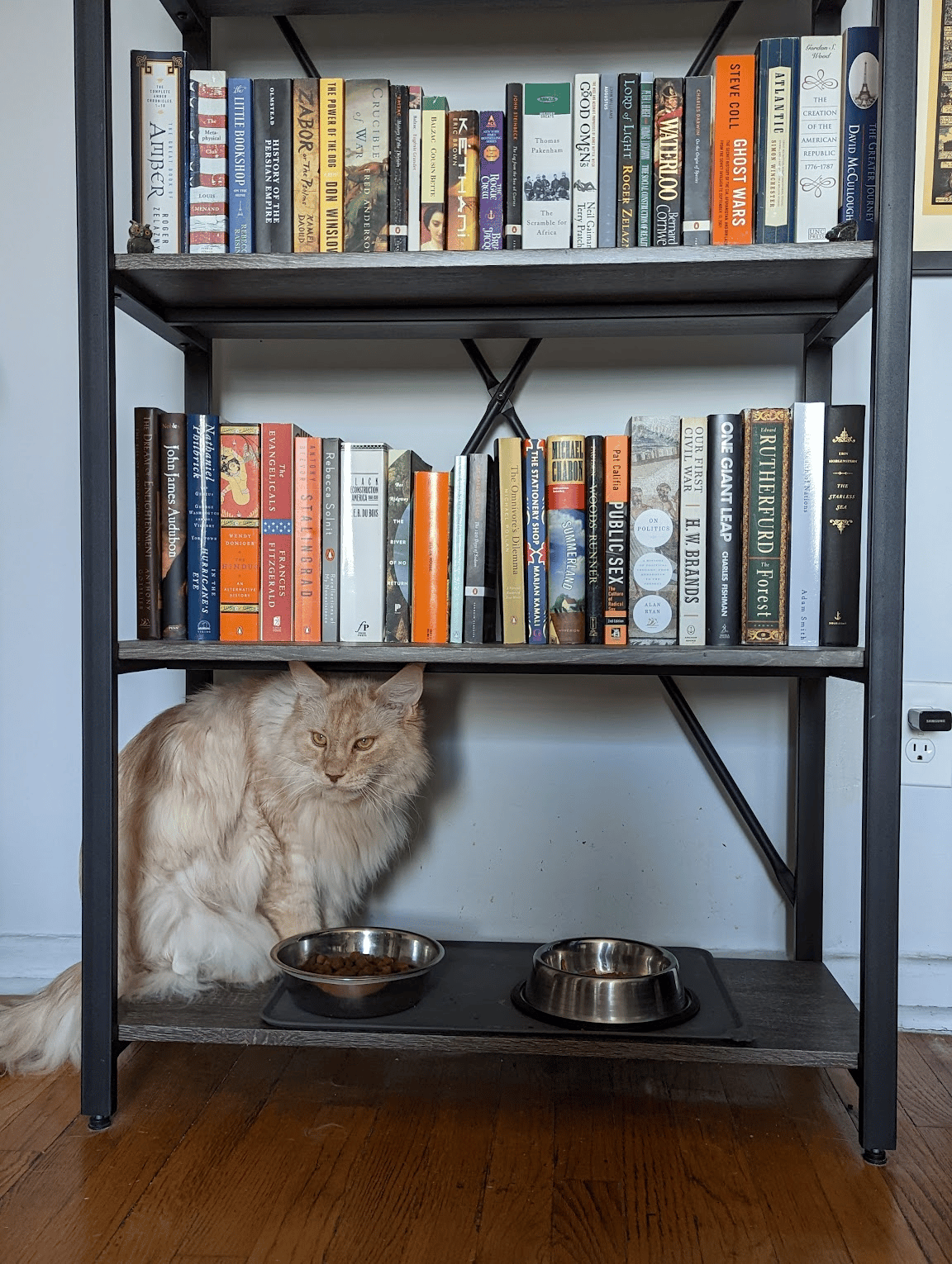 Cat meets books.